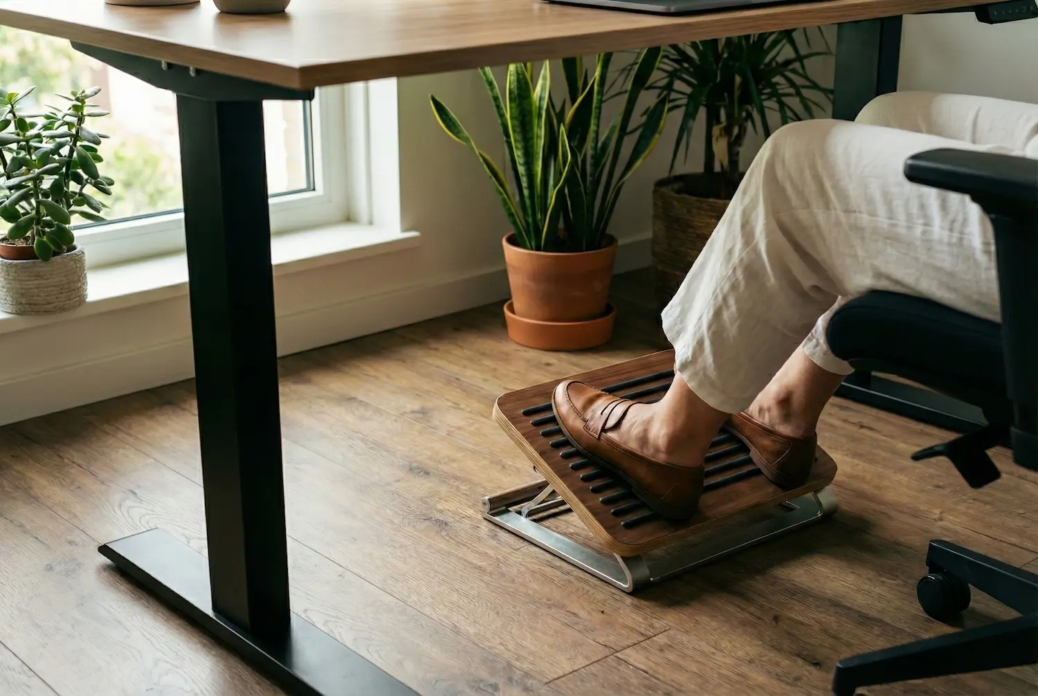 🔍 Waarom belangrijk? Een verstelbare voetensteun laat je lichaam ontspannen zitten, met je knieën in een hoek van ongeveer 90 graden. Daardoor krijg je minder druk op je onderrug en bovenbenen.